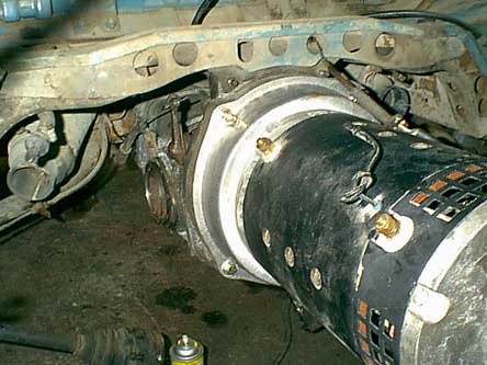 The Bus Project Here is a close up of the motor hanging off the back of the transmission, just like a bug motor does. We will see if additional bracing will be needed in the form of a rear mount. The electric weighs less than a bug motor... but I'm not convinced yet.